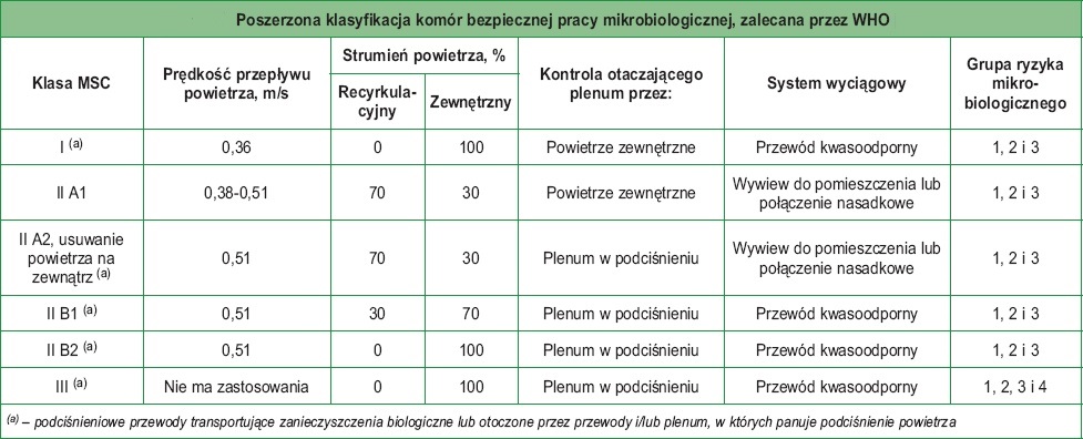 Wykorzystywana jest nie tylko trzystopniowa klasyfikacja komór laminarnych bezpiecznej pracy mikrobiologicznej zamieszczona w normie PN-EN 12469:2002. W praktyce znajduje zastosowanie poszerzona systematyzacja rekomendowana przez WHO. Uwzględnia również konstrukcję, prędkość i wielkość przepływu oraz wywiew powietrza.