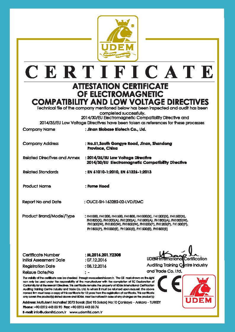 Grupa BIOBASE posiada certyfikaty, w tym ISO9001, ISO13485, ISO 14001, SGS, CE, NSF, EN, FDA itp.
