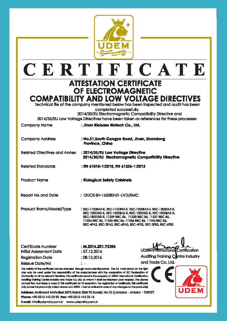 Grupa BIOBASE posiada certyfikaty, w tym ISO9001, ISO13485, ISO 14001, SGS, CE, NSF, EN, FDA itp.